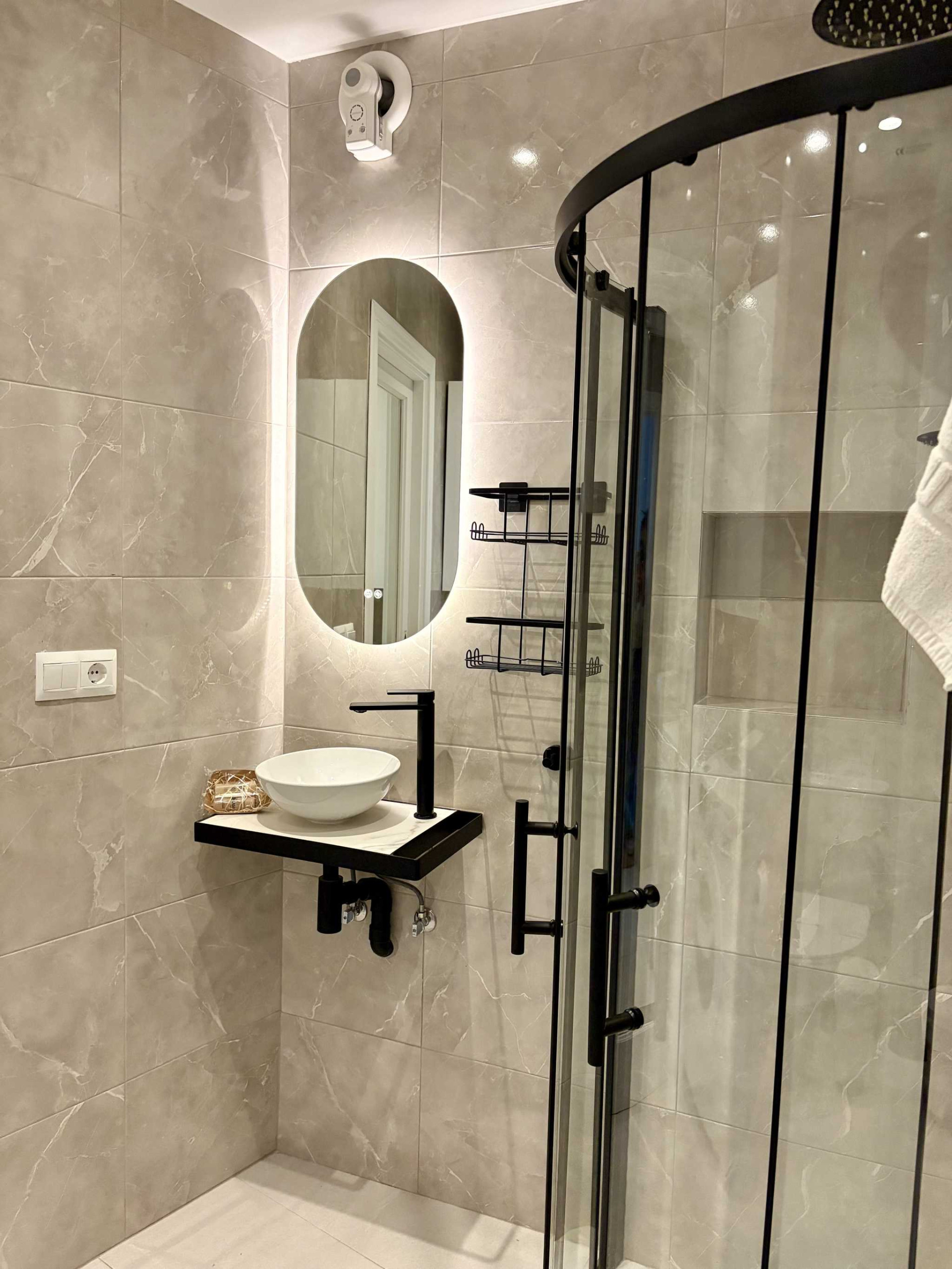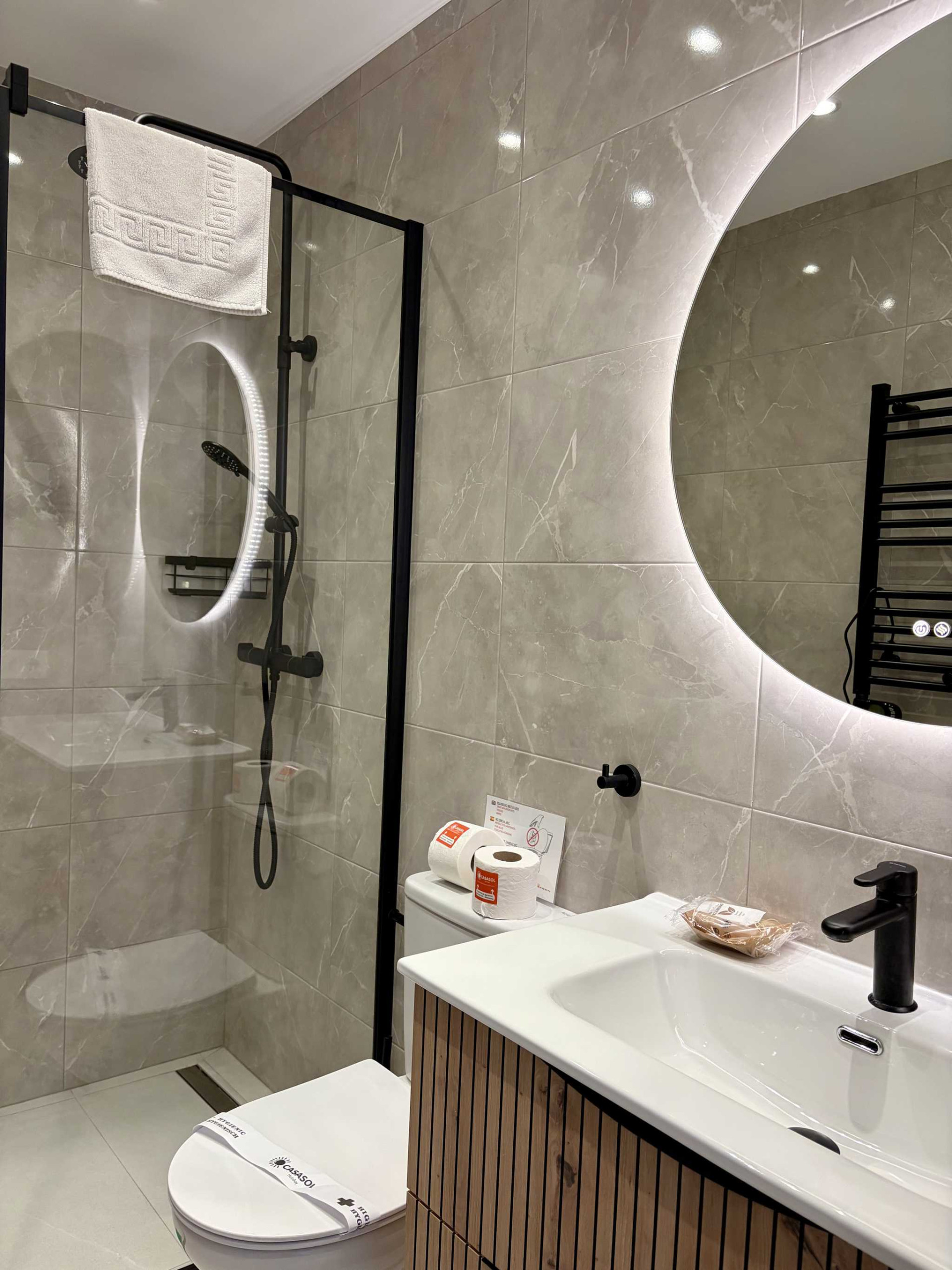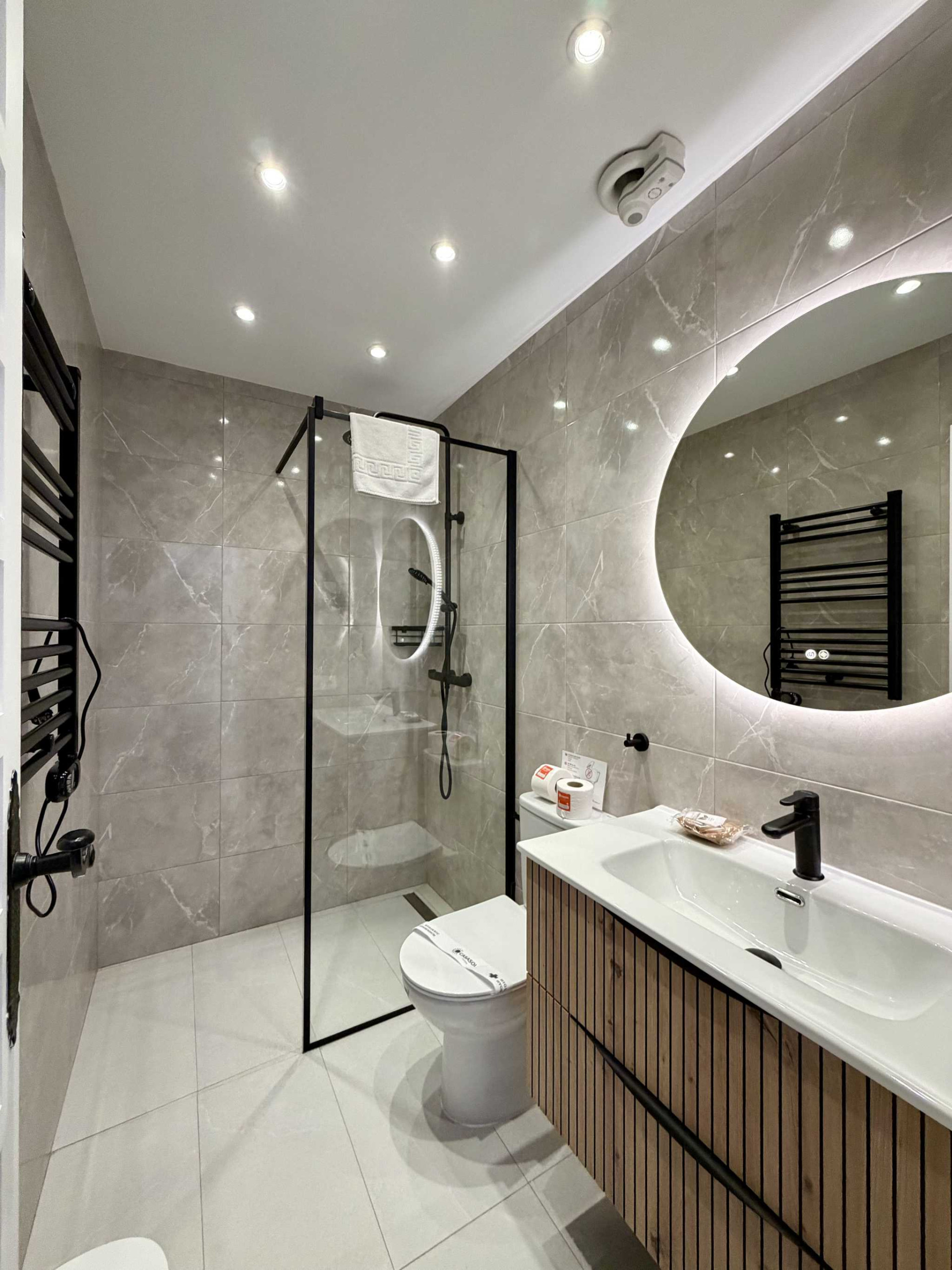 - Un secondo bagno moderno accessibile dal corridoio con doccia, WC e finiture eleganti.