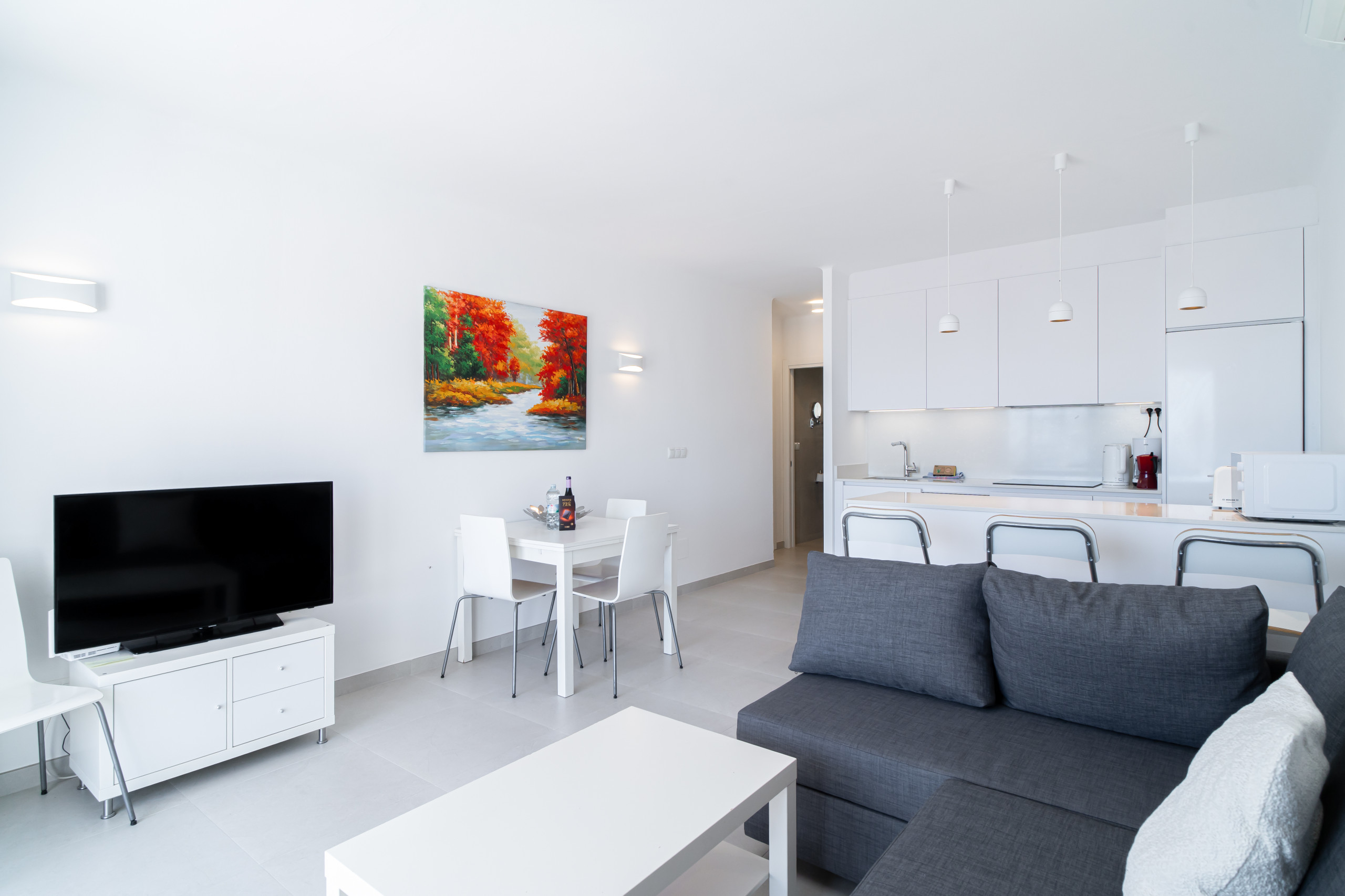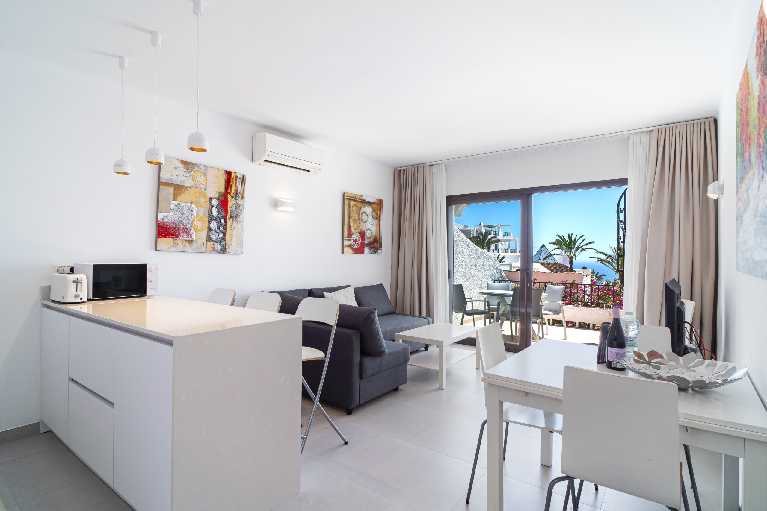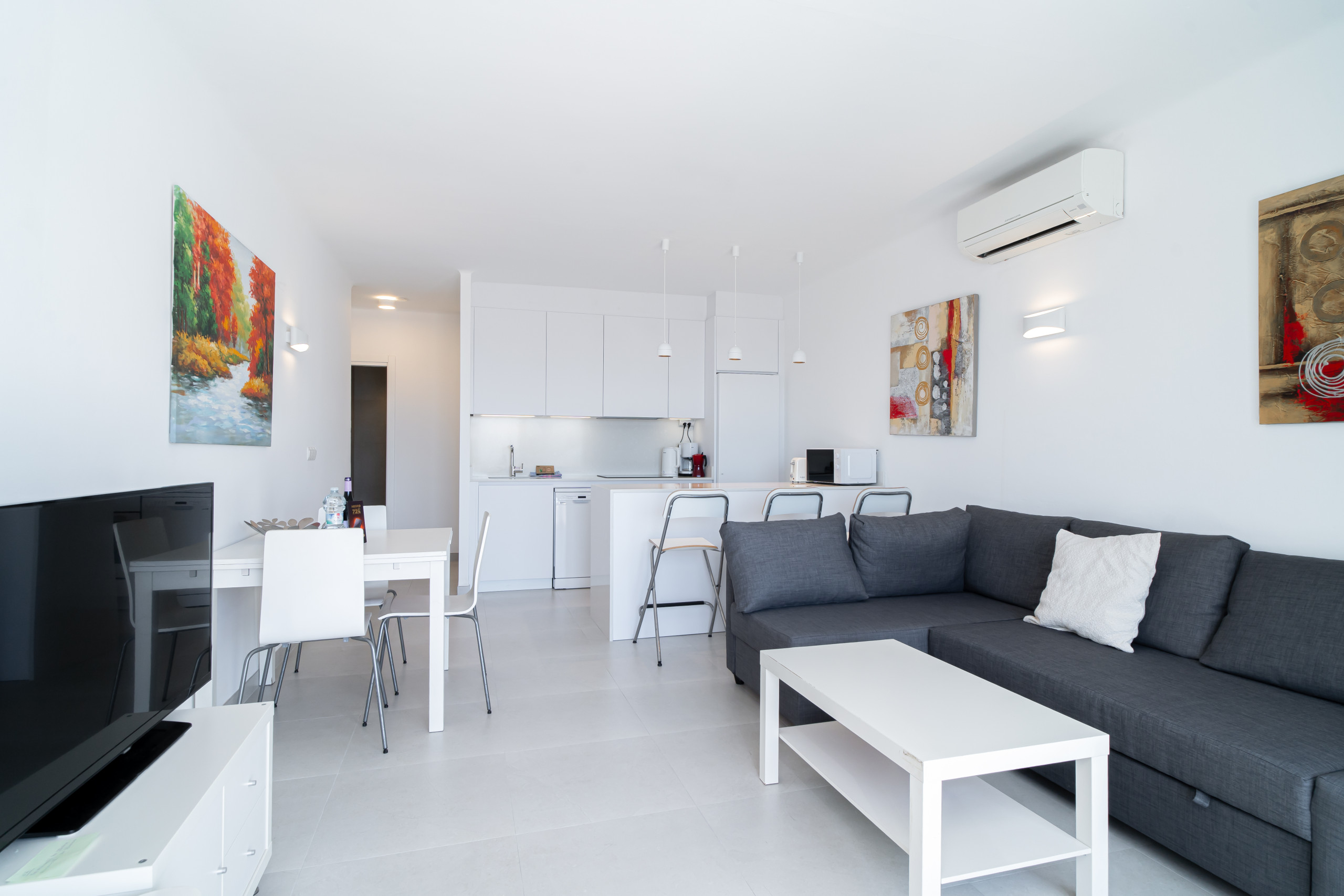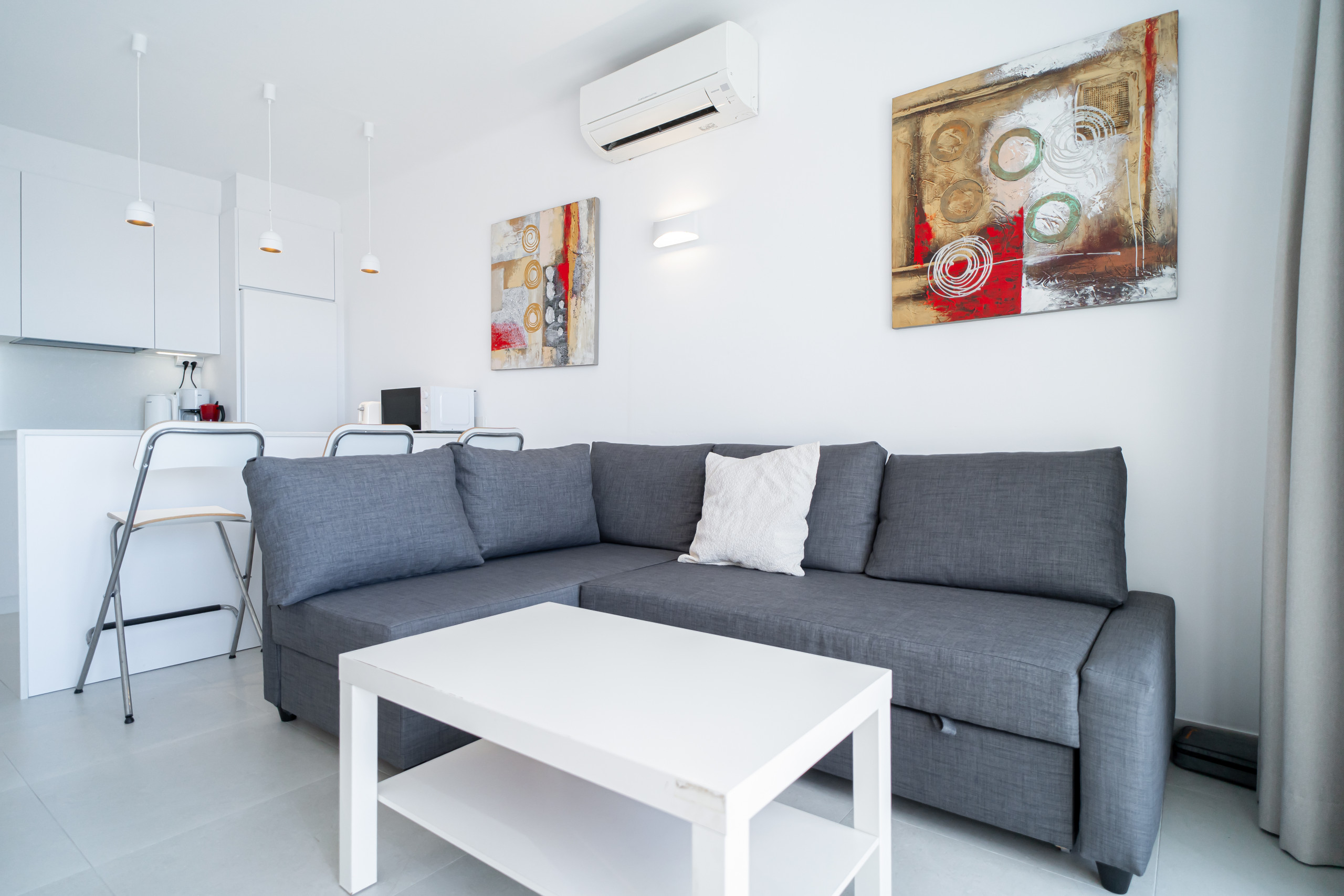 Il soggiorno, inondato di luce naturale grazie alla sua esposizione a sud, è dotato di aria condizionata, Smart TV con canali internazionali e WiFi ad alta velocità.