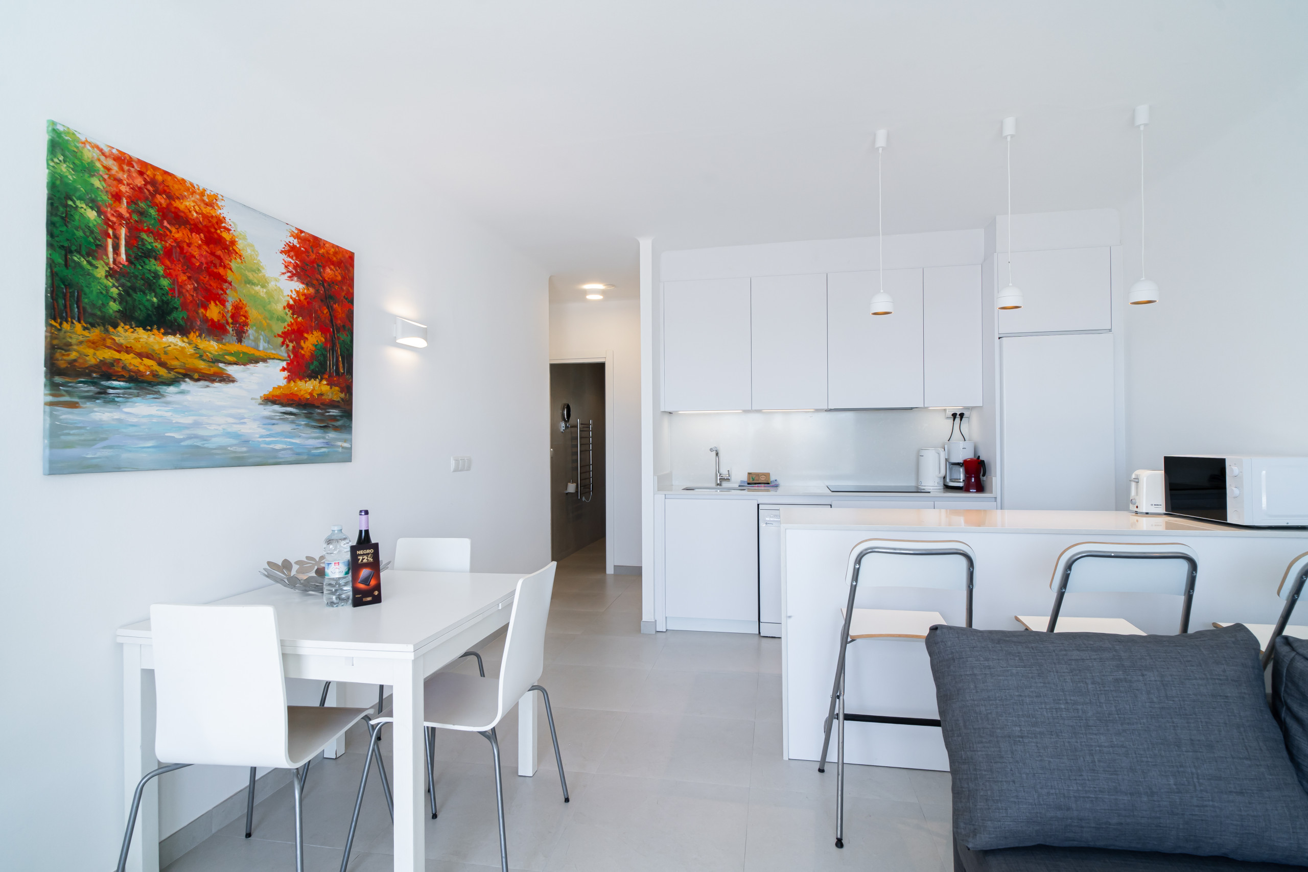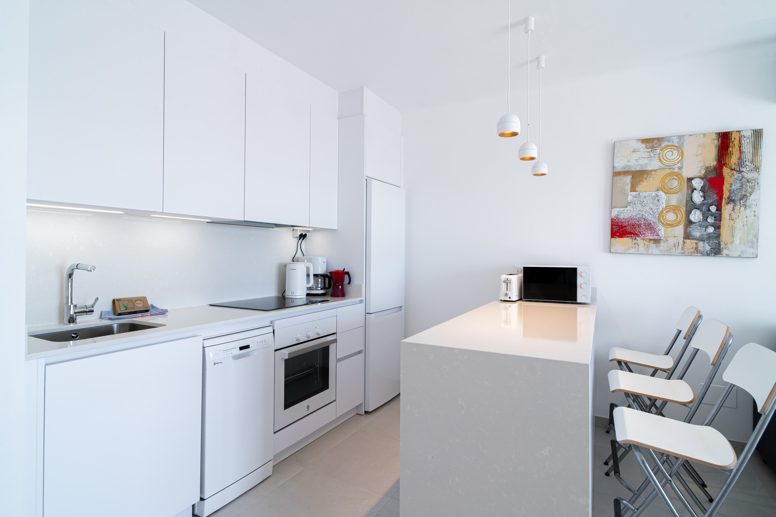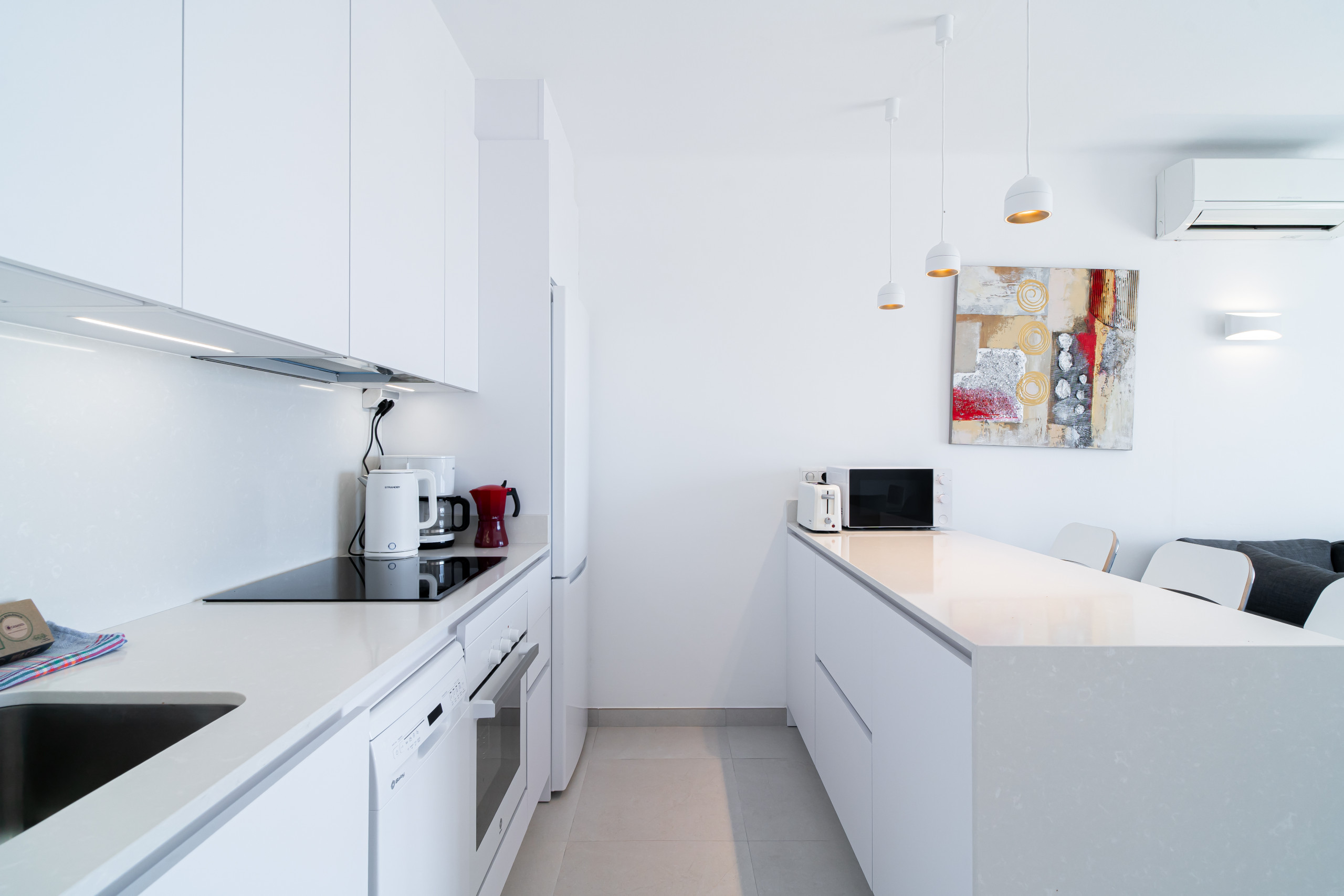 La moderna cucina a vista include una lavastoviglie e tutti gli elettrodomestici essenziali per sentirsi come a casa.