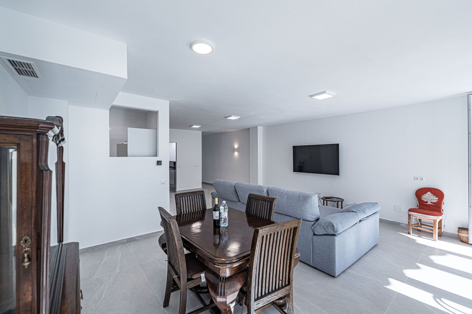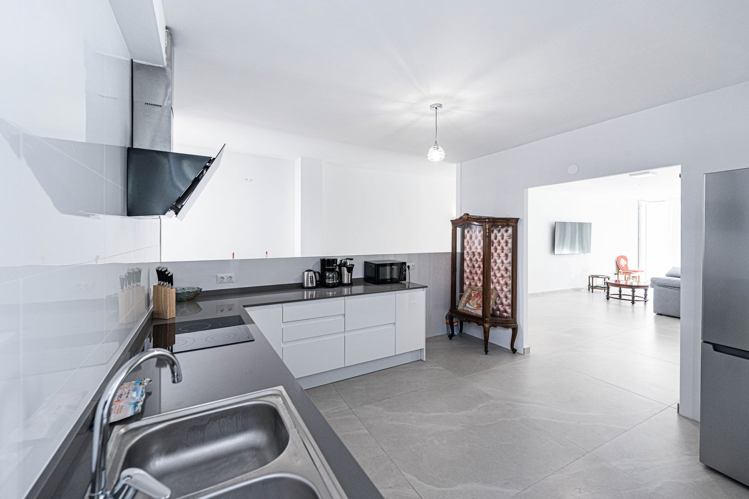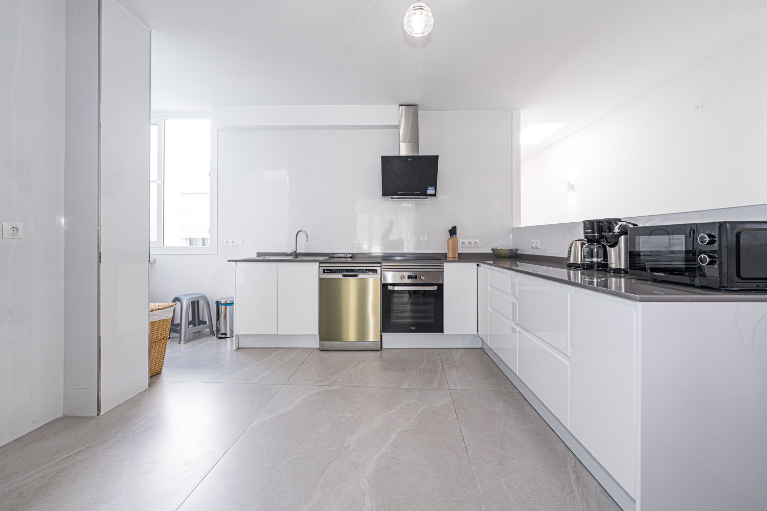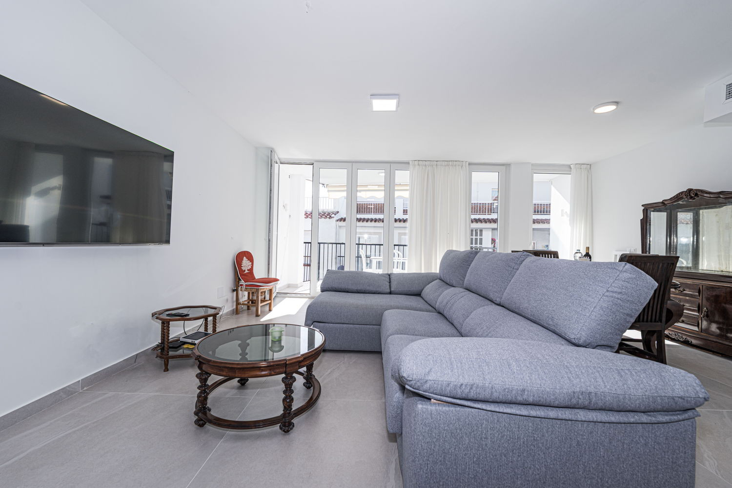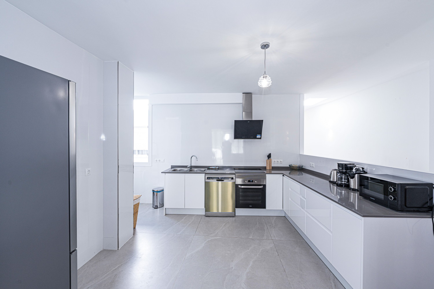 Vita interna ed esterna: Il cuore della casa è un salone eccezionalmente ampio e luminoso, collegato direttamente alla terrazza esterna che si affaccia sulla strada principale. Questa fluidità permette alla brezza del centro di rinfrescare l'intero ambiente. La cucina è dotata di elettrodomestici di alta gamma ed è completamente attrezzata con tutto il necessario per il vostro soggiorno, compresi lavastoviglie, forno e microonde. È uno spazio funzionale e moderno, ideale per preparare da un caffè veloce prima di andare in spiaggia a una cena completa in famiglia.