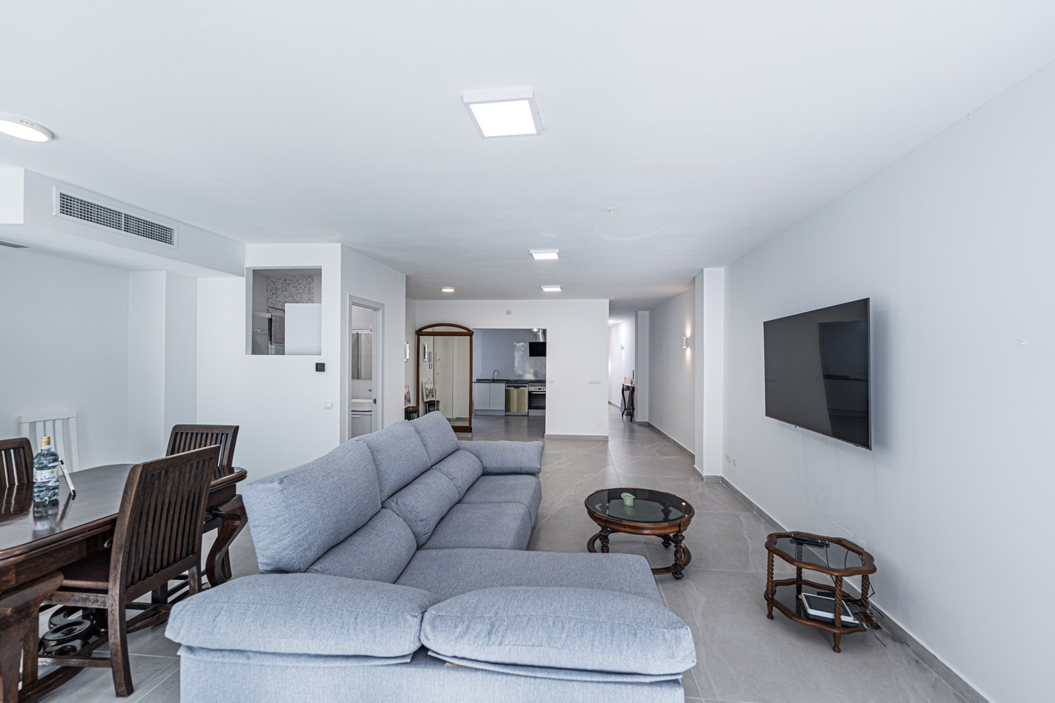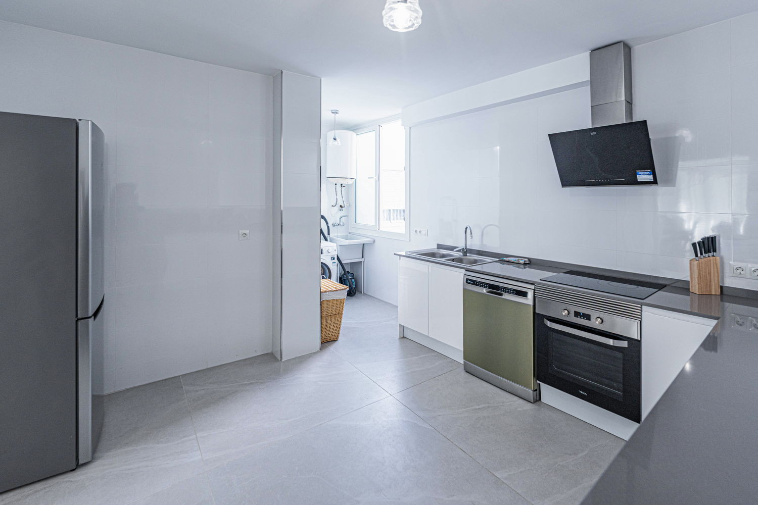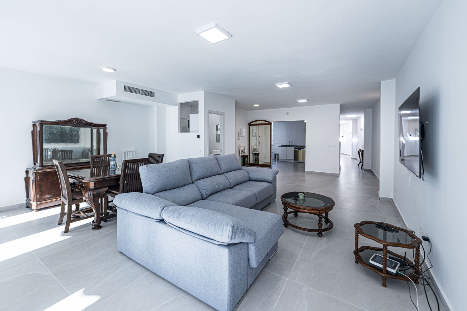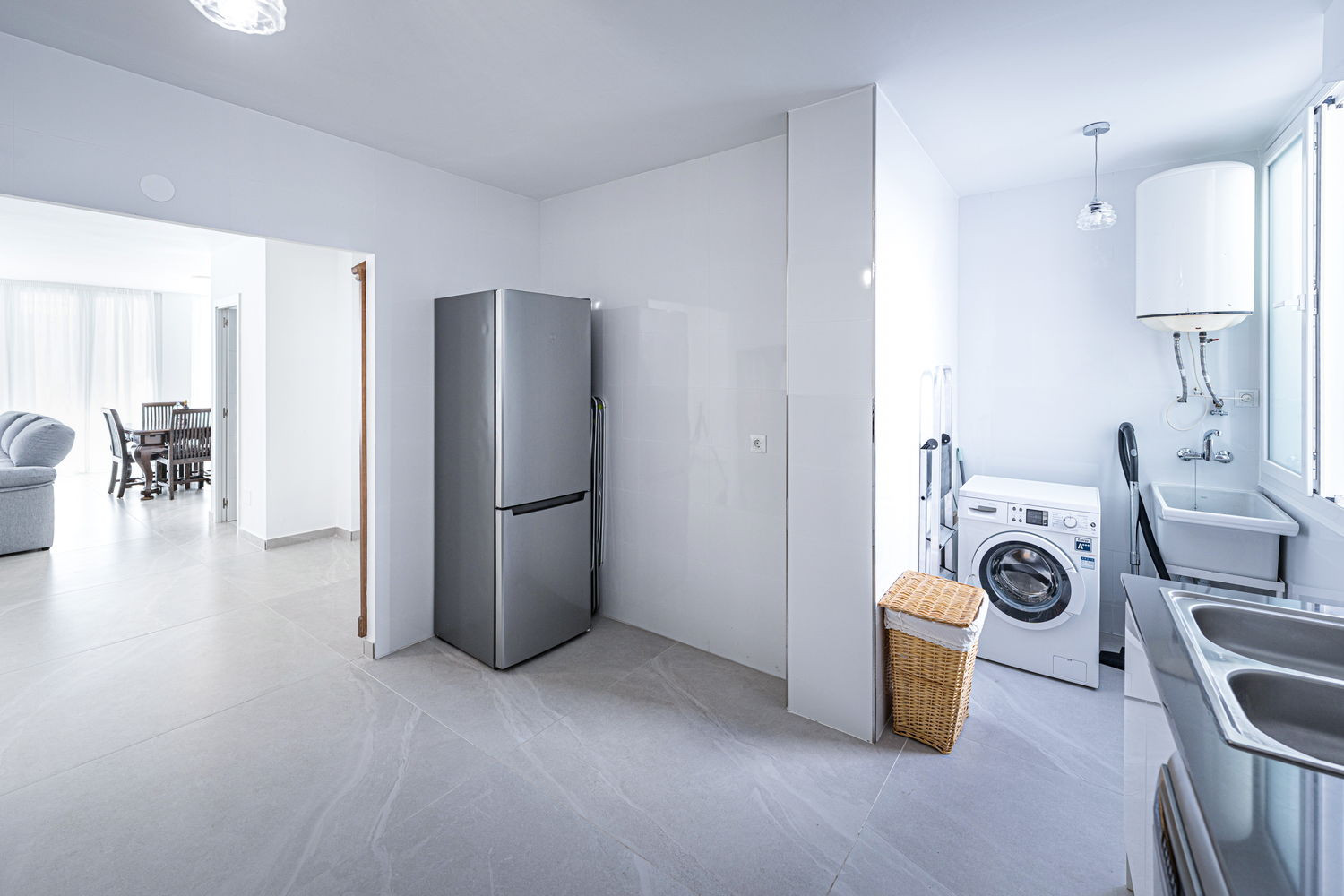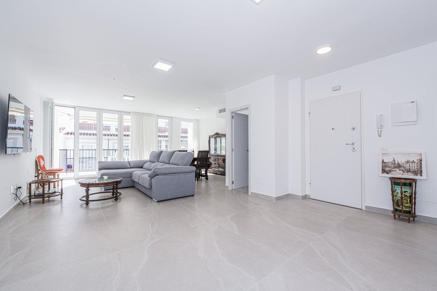 Vita interna ed esterna: Il cuore della casa è un salone eccezionalmente ampio e luminoso, collegato direttamente alla terrazza esterna che si affaccia sulla strada principale. Questa fluidità permette alla brezza del centro di rinfrescare l'intero ambiente. La cucina è dotata di elettrodomestici di alta gamma ed è completamente attrezzata con tutto il necessario per il vostro soggiorno, compresi lavastoviglie, forno e microonde. È uno spazio funzionale e moderno, ideale per preparare da un caffè veloce prima di andare in spiaggia a una cena completa in famiglia.