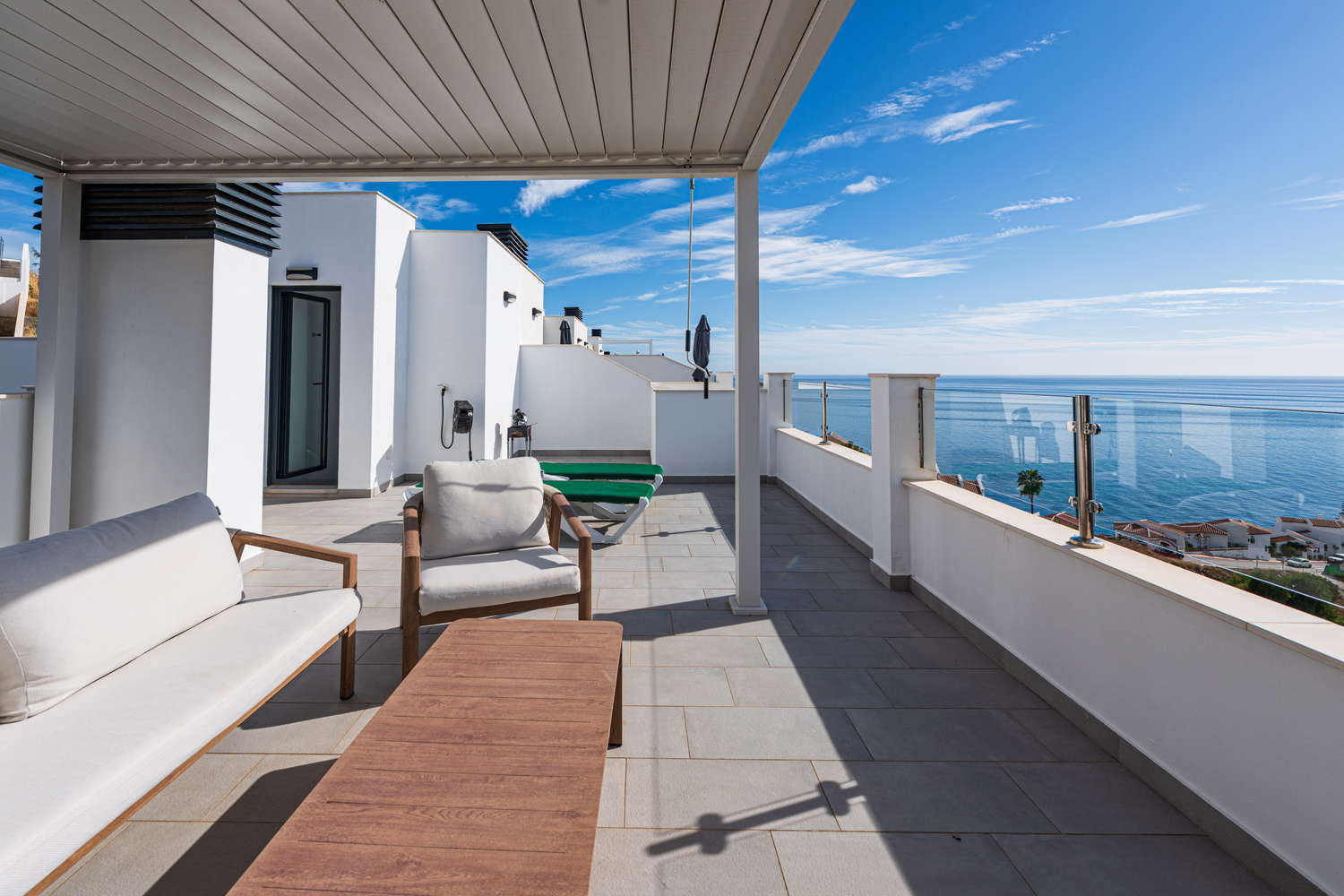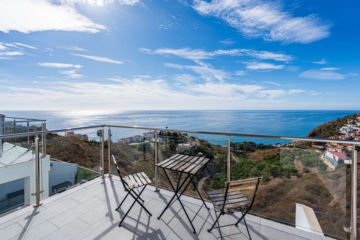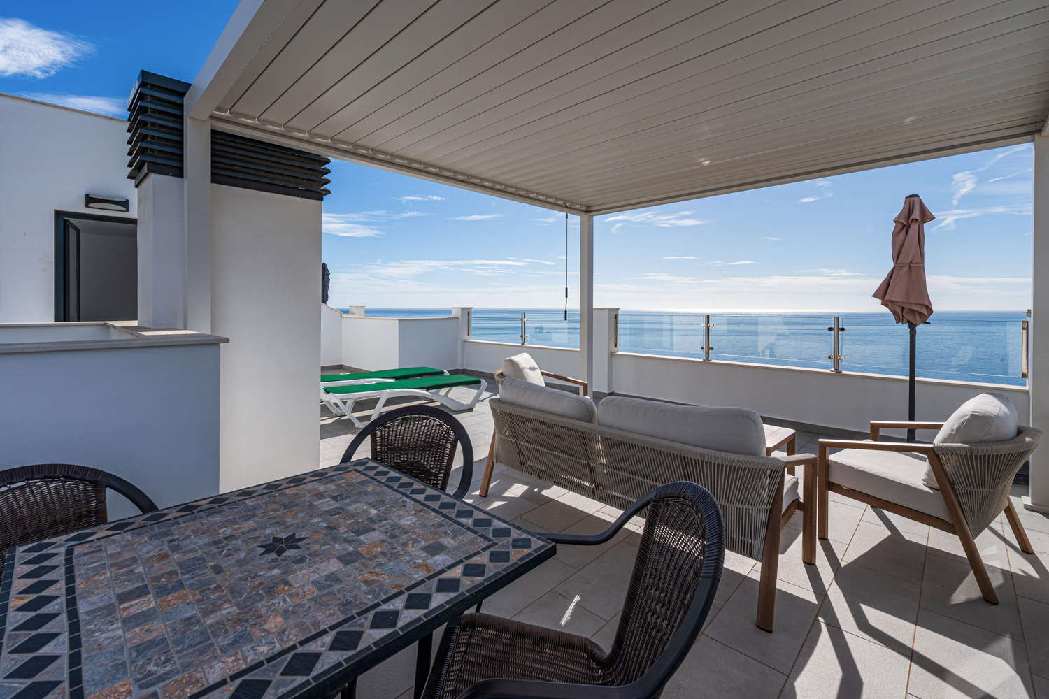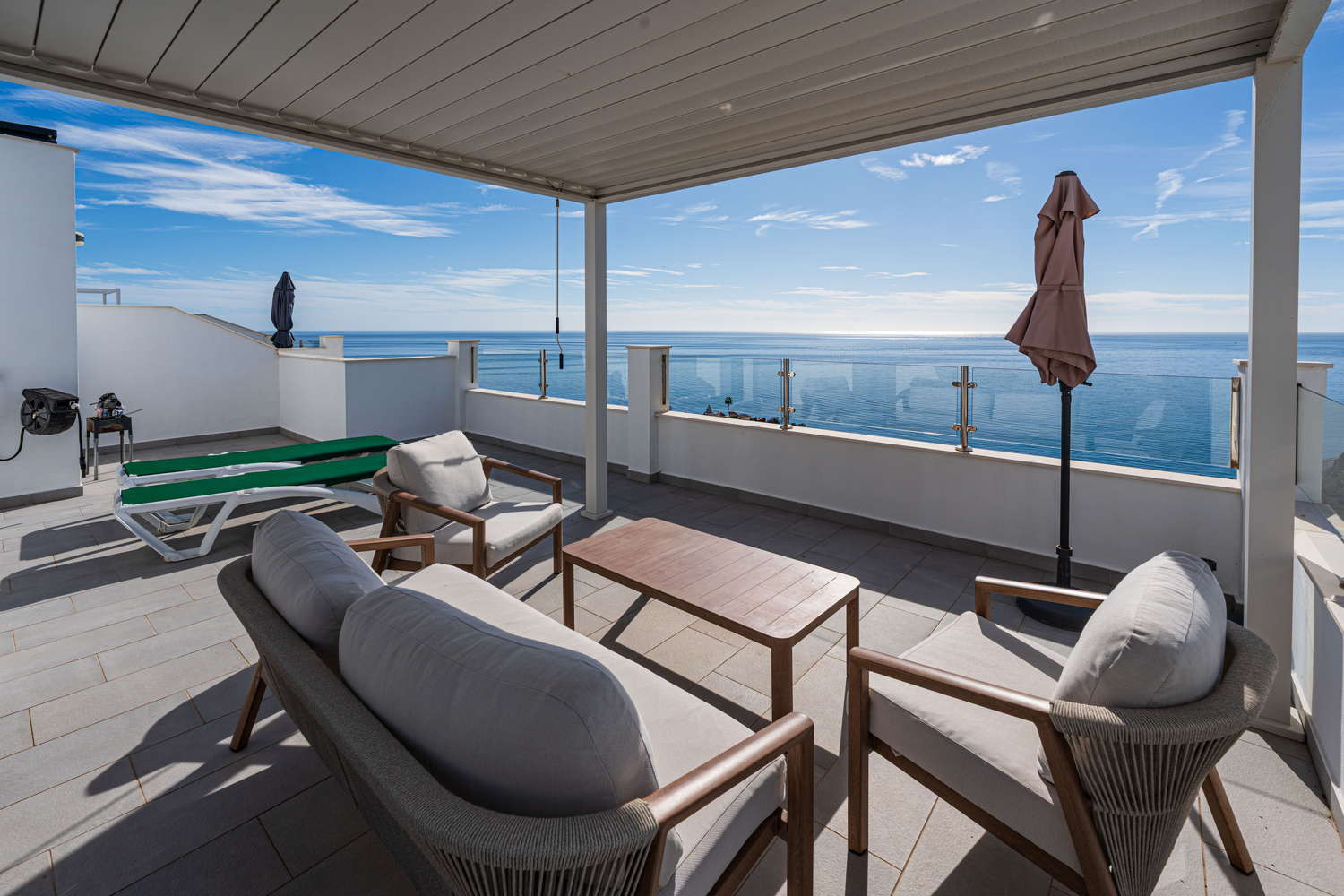 Ma il vero gioiello di questa proprietà sono le sue tre terrazze mozzafiato con viste mozzafiato sul mare e sole infinito - in particolare quella magnifica con vista panoramica.