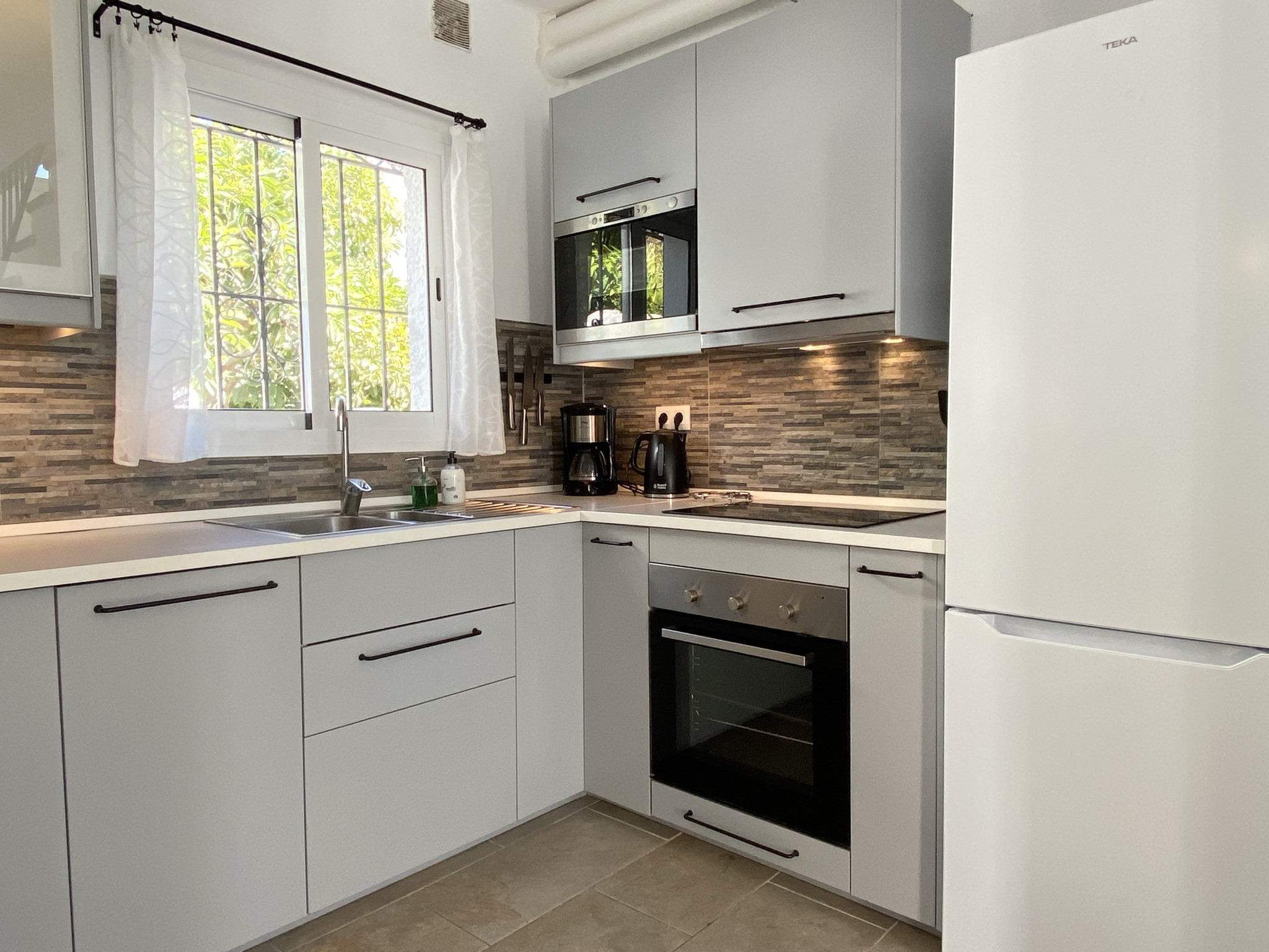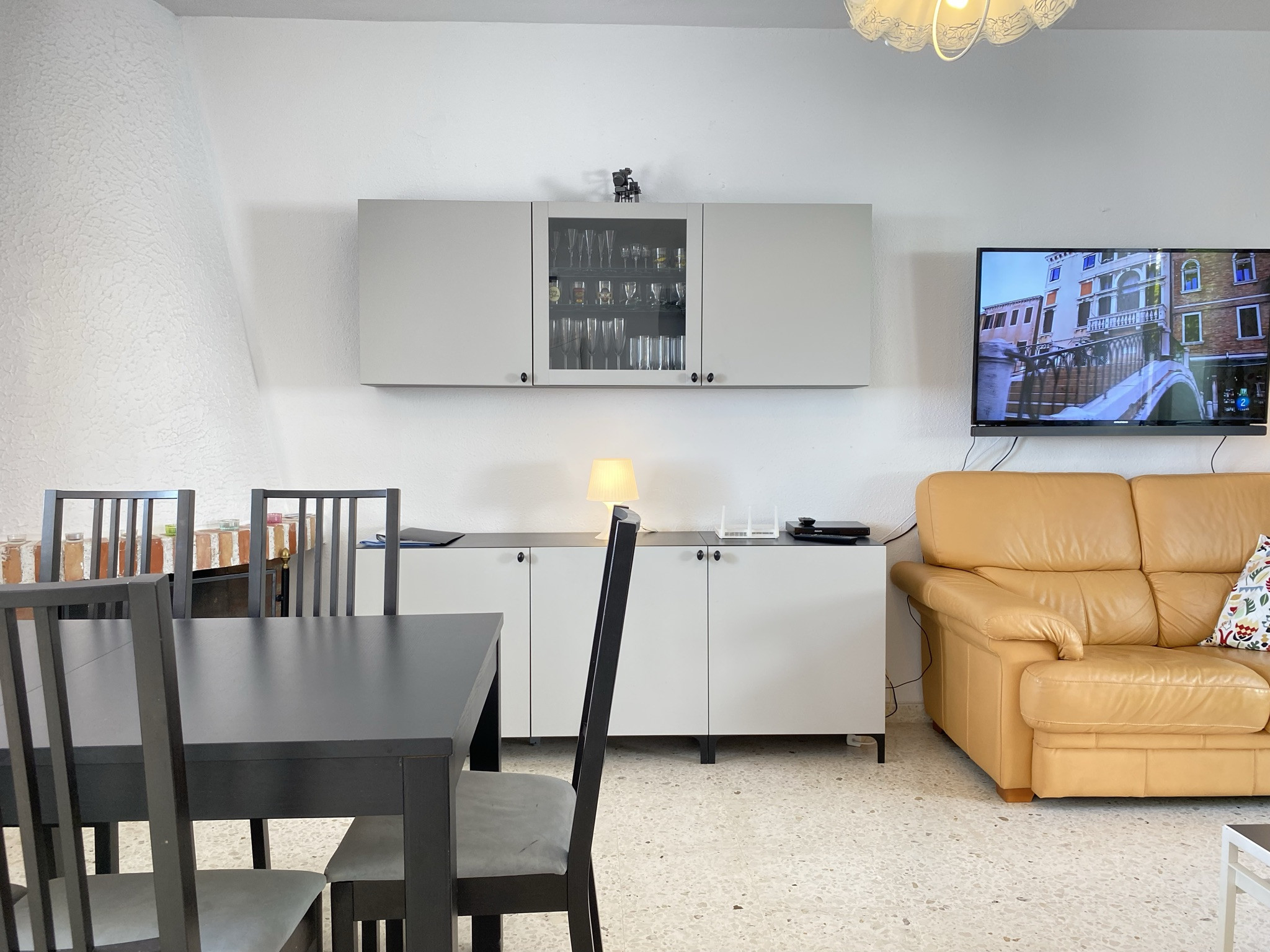 La nuovissima cucina completamente attrezzata è in un luminoso e spazioso open space con divani, zona pranzo e ha tutto ciò di cui potresti aver bisogno per sfruttare al meglio la tua vacanza, come piano cottura a induzione, forno, microonde e lavastoviglie.