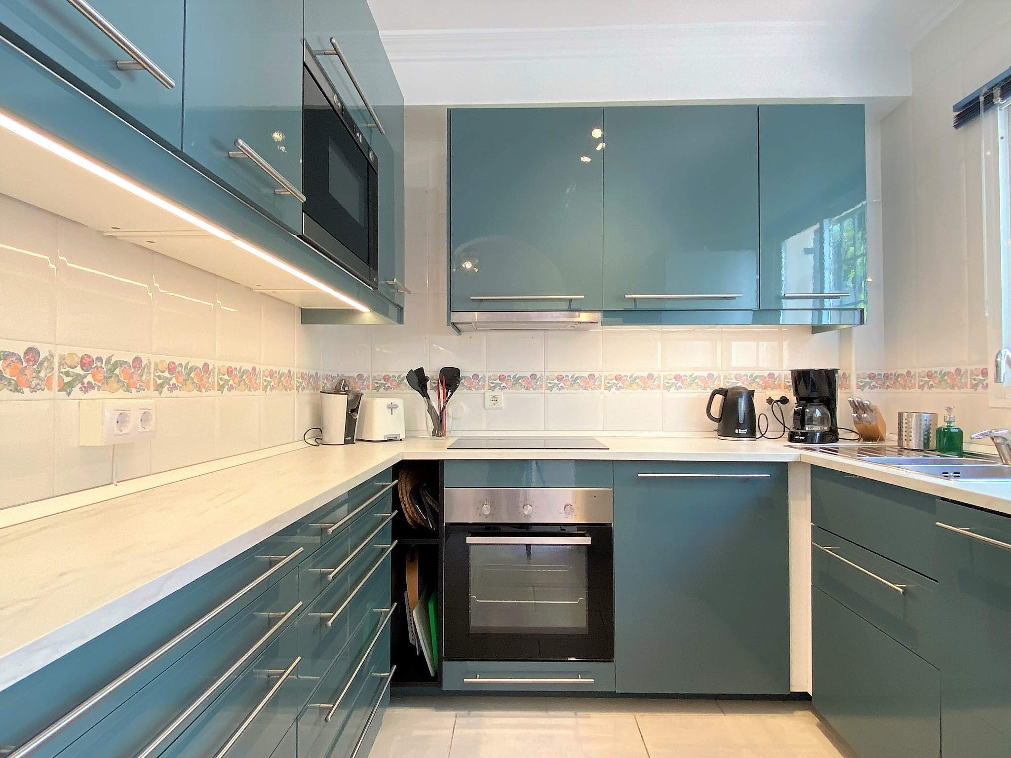 La nuova cucina completamente attrezzata ha tutto ciò di cui potresti aver bisogno per sfruttare al meglio la tua vacanza, inclusi piano cottura a induzione, forno, microonde e lavastoviglie. Inoltre, un bagno completo e una terrazza soleggiata (9 m2), con mobili da terrazza e tenda da sole, con orientamento sud-ovest e una vista spettacolare sulla piscina, sul mare, sulla città e sulle montagne.