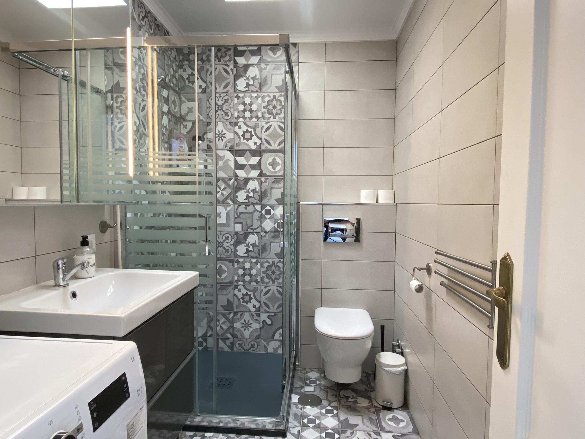 Inoltre, a questo livello un moderno bagno con doccia, lavatrice (con asciugatrice integrata). C'è anche un ferro e asse da stiro e un asciugacapelli.