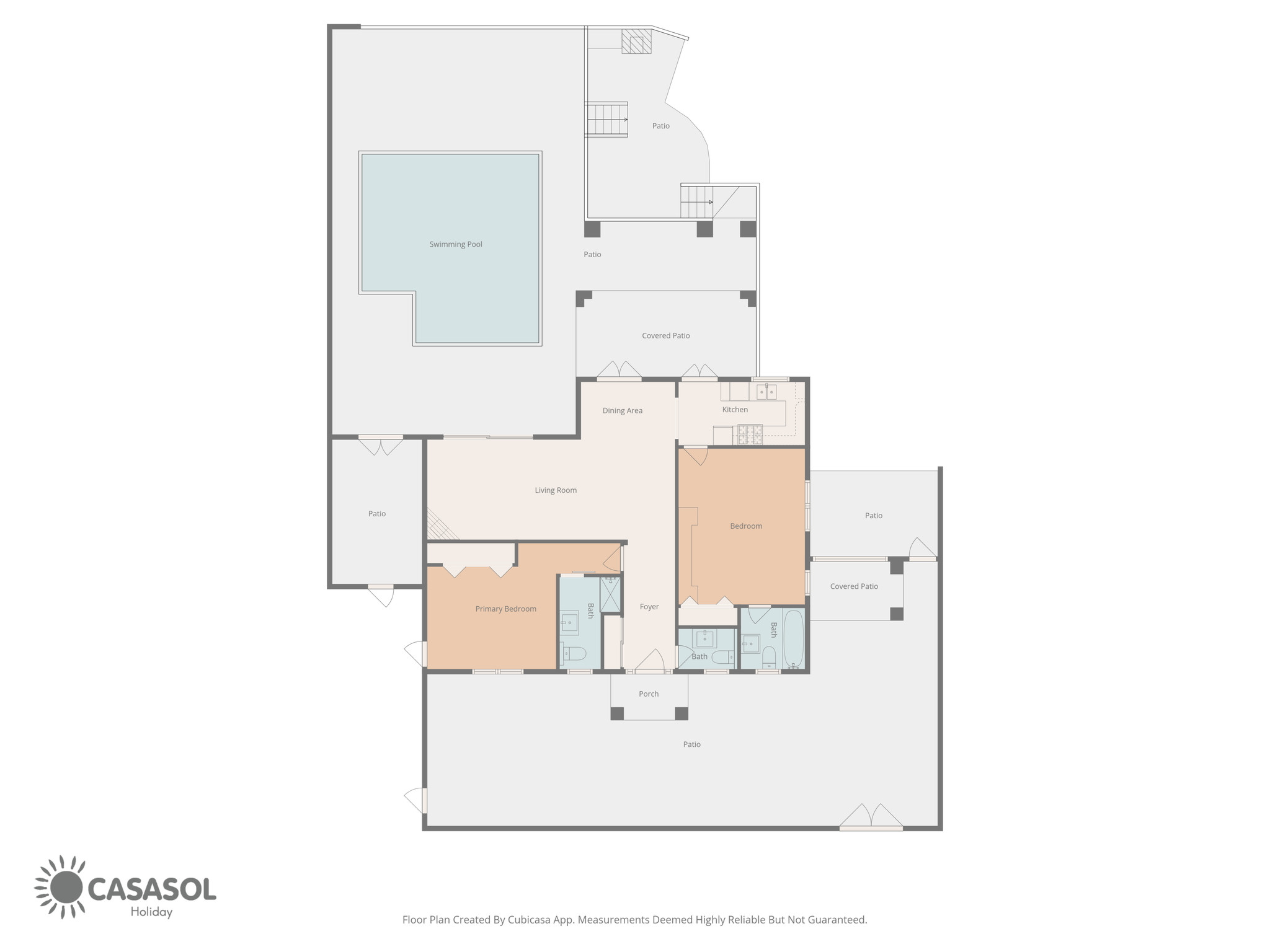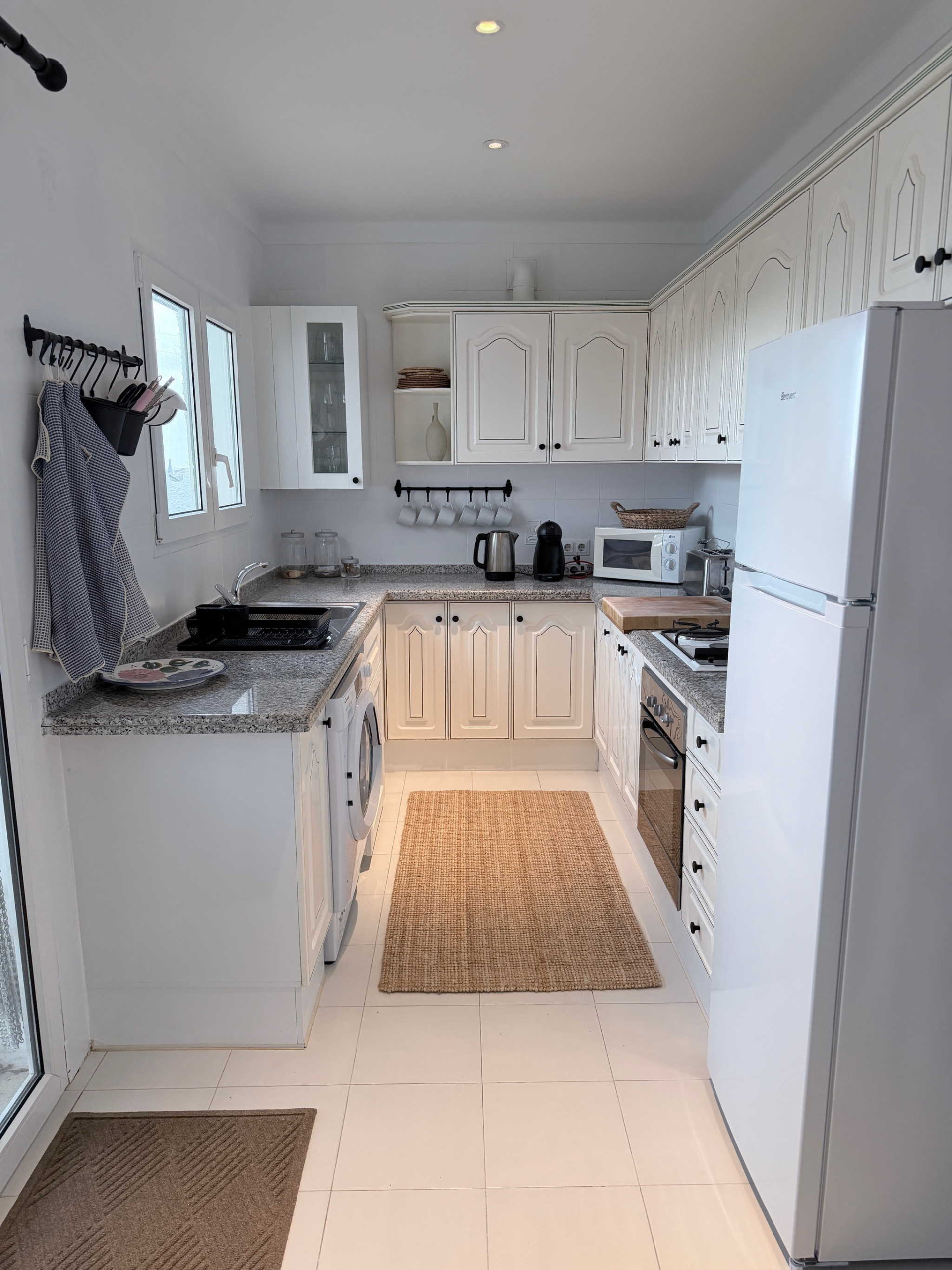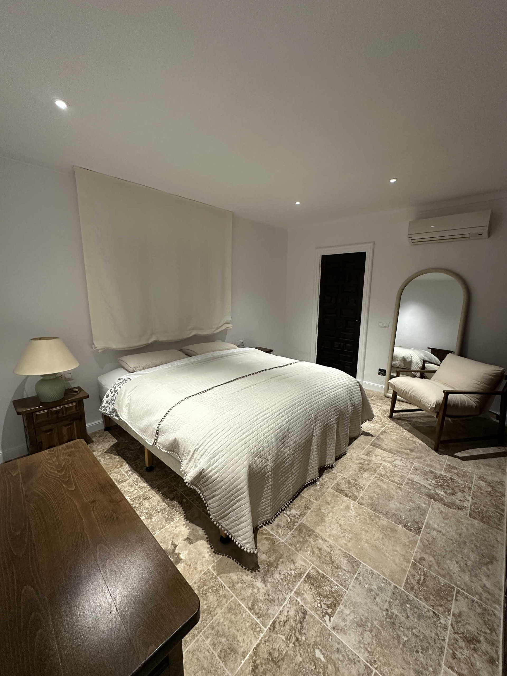 La disposizione della casa è stata pensata per il comfort di quattro persone. All'ingresso, un pratico bagno di servizio è a disposizione delle zone comuni. A sinistra si trova la prima camera da letto, dotata di un letto matrimoniale di qualità e di un bagno privato en suite. Il salotto, arredato in stile contemporaneo e accogliente, si collega a una cucina semi-aperta completamente attrezzata. Dall'altra parte della stanza, anche la seconda camera da letto dispone di un proprio bagno privato e di un letto matrimoniale. Questa configurazione a “doppia suite” garantisce che ogni coppia o ospite abbia il proprio spazio di intimità senza dover condividere il bagno.