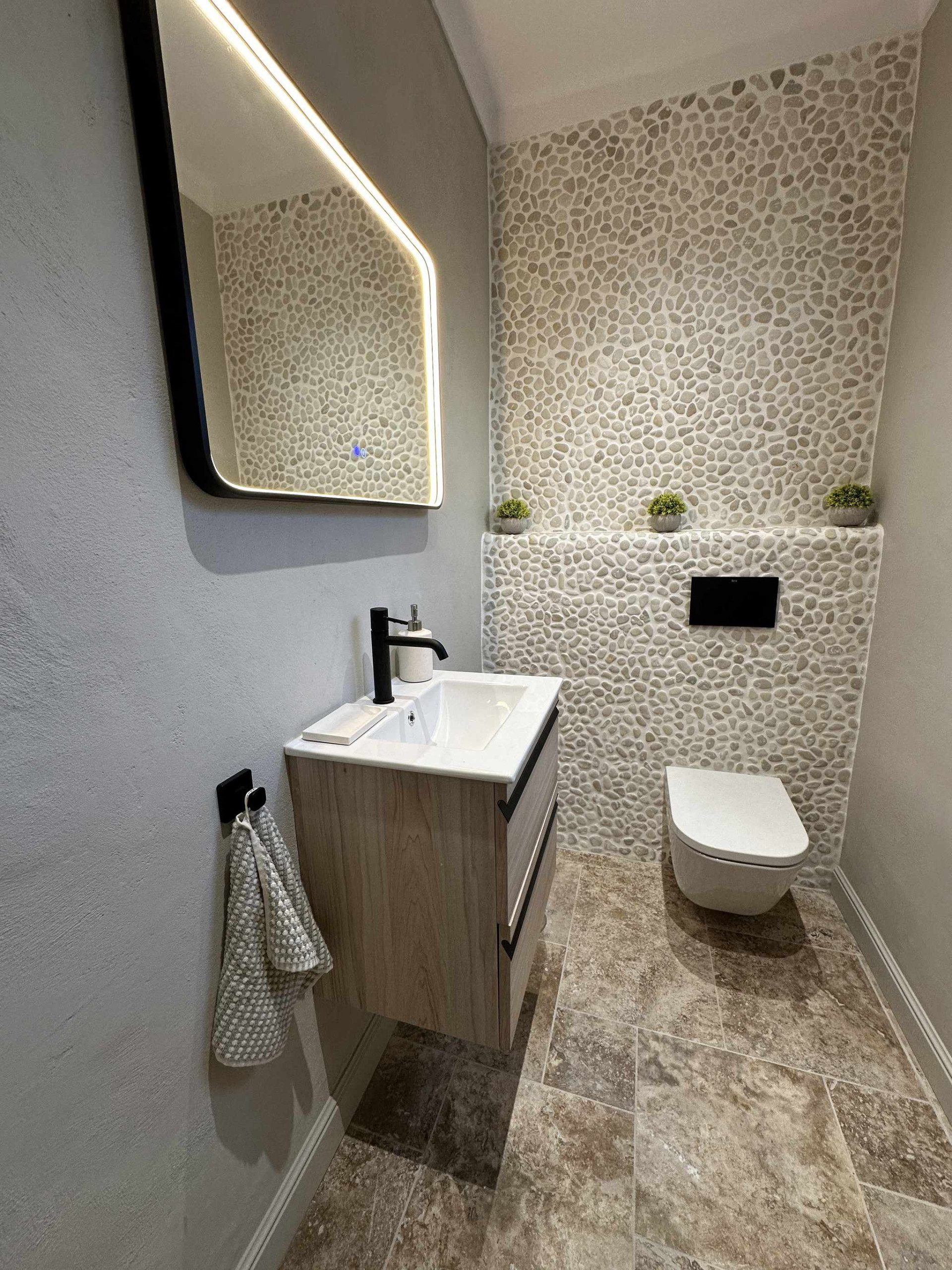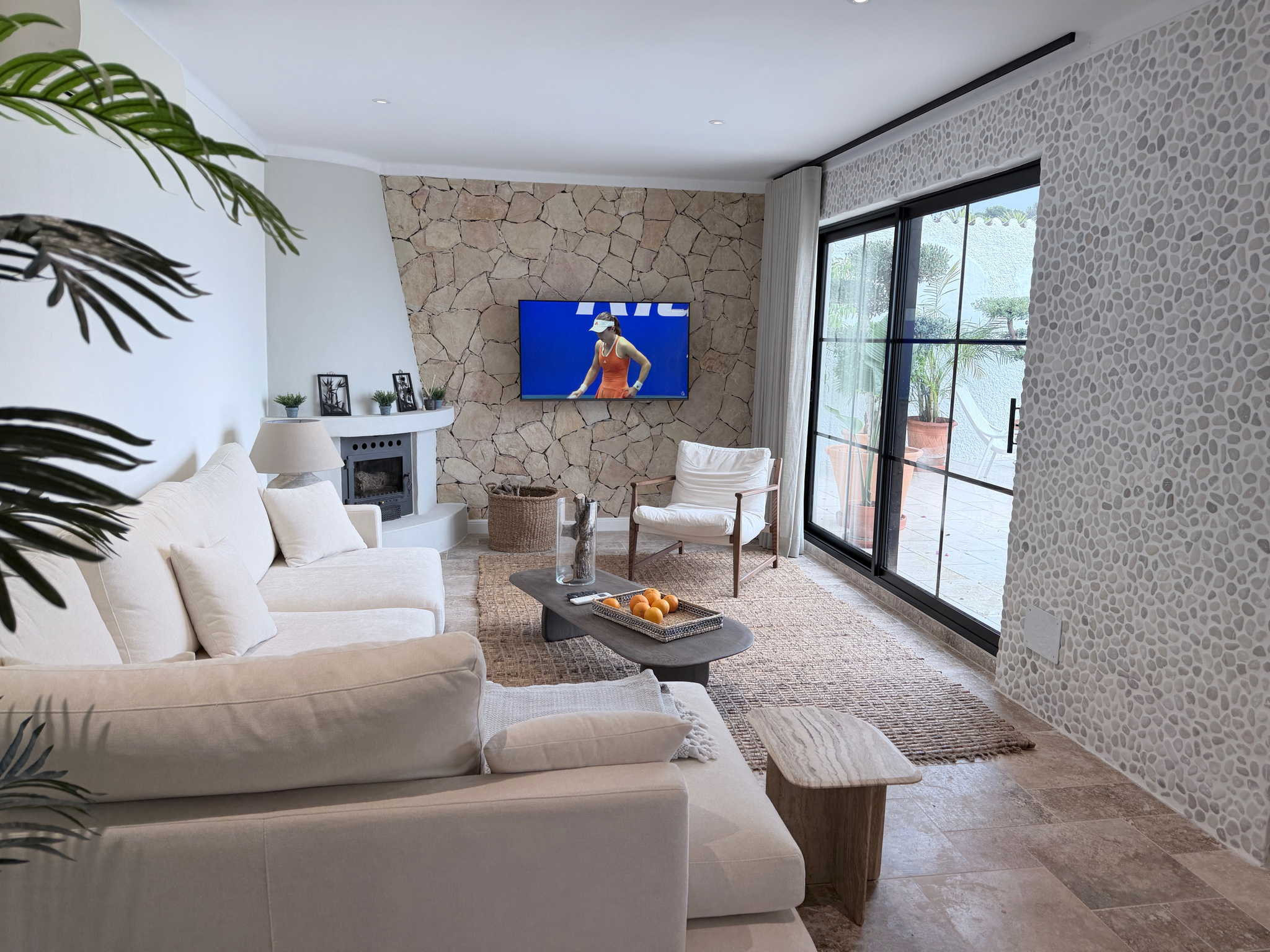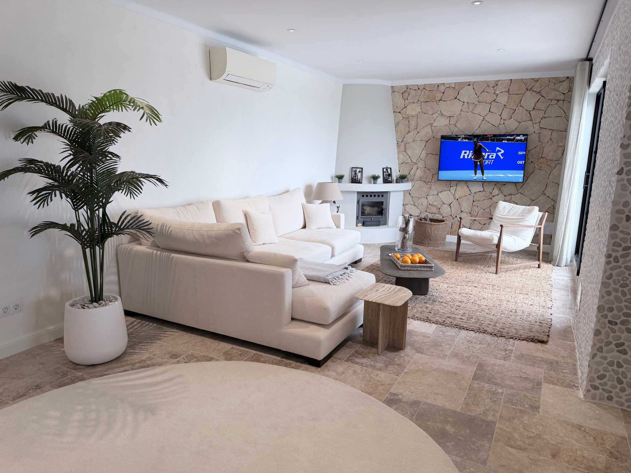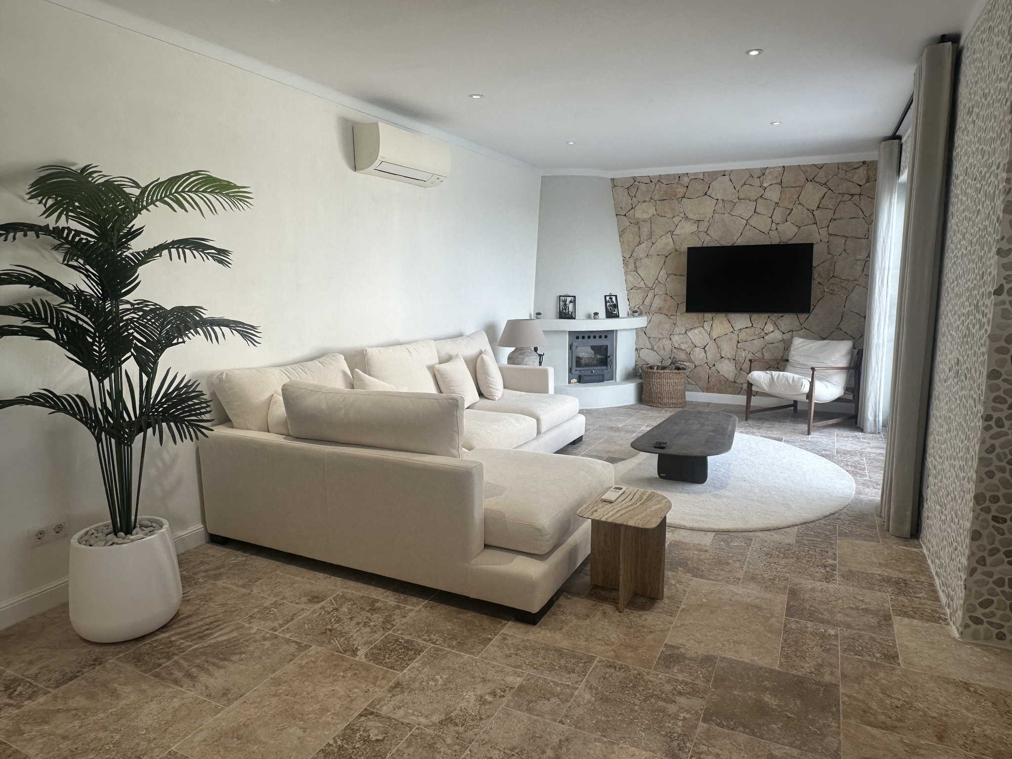 La disposizione della casa è stata pensata per il comfort di quattro persone. All'ingresso, un pratico bagno di servizio è a disposizione delle zone comuni. A sinistra si trova la prima camera da letto, dotata di un letto matrimoniale di qualità e di un bagno privato en suite. Il salotto, arredato in stile contemporaneo e accogliente, si collega a una cucina semi-aperta completamente attrezzata. Dall'altra parte della stanza, anche la seconda camera da letto dispone di un proprio bagno privato e di un letto matrimoniale. Questa configurazione a “doppia suite” garantisce che ogni coppia o ospite abbia il proprio spazio di intimità senza dover condividere il bagno.