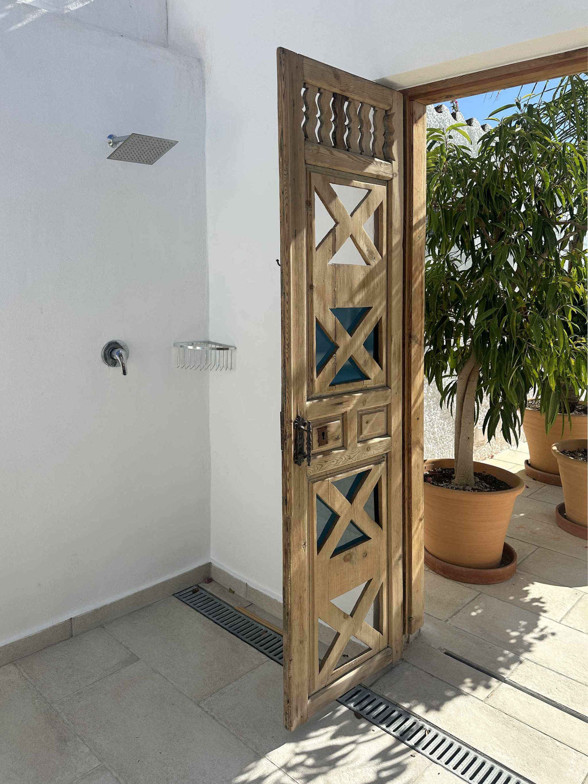 L'esterno è il punto di forza della villa ed è organizzato per sfruttare ogni metro quadrato. Appena uscendo all'aperto, troverete la zona della piscina privata con vista aperta e un'area con lettini. A sinistra è disponibile una comoda doccia all'aperto e uno stendibiancheria, mentre a destra c'è un tavolo da esterno per le vostre cene all'aperto. Scendendo pochi gradini, si accede a una zona giardino indipendente che ospita un barbecue in muratura privato, l'angolo perfetto per cucinare alla griglia in totale indipendenza dall'area bagno.